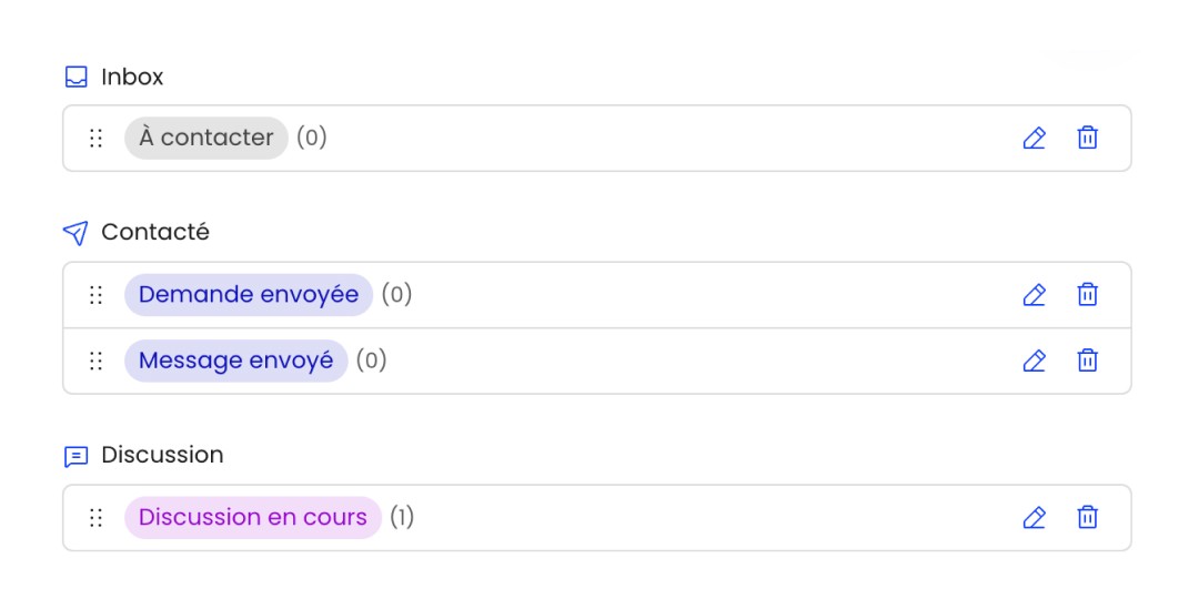Ces étapes ne sont pas modifiables afin de garantir des statistiques fiables sur votre taux de réponse, de conversion et d’appels bookés.